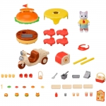 В комплекте: фигурка латте-кота, скутер для доставки с багажным отделением, многофункциональный бургер-трансформер (включает 4 стула, стол, прилавок), 30 аксессуаров (касса, ингредиенты для всевозможных гамбургеров, картошка фри, напитки кухонная утварь, подносы и др.).